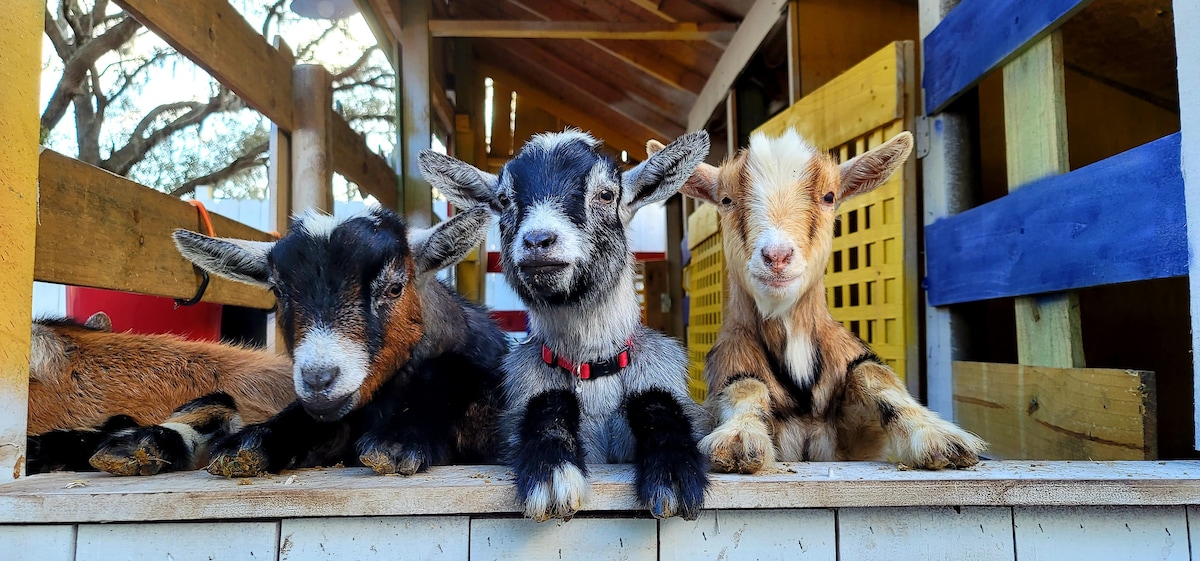 5 natural springs 4 to 10 minutes away Fur Babies WELCOME FREE Farm Fresh Eggs Pet the goats Feed the Chickens NO ROOSTERS! Fire pit (we set up the wood daily) Tree swing/bench swing Cornhole Grills Picnic pavilion 5 Acres 2 King 1 Twin pull-out 1 queen inflatable bed The kitchen is fully stocked. Disney 40 min Rock Springs 3 min Kings Landing, Kelly Park, Wekiwa Springs, Barrel Springs, and Wekiva Springs are all less than 5 MILES away. Wekiva Island is a Must VISIT!