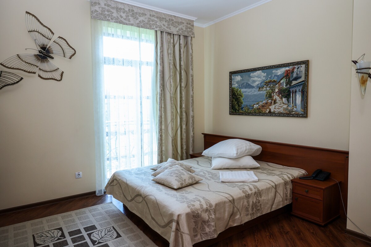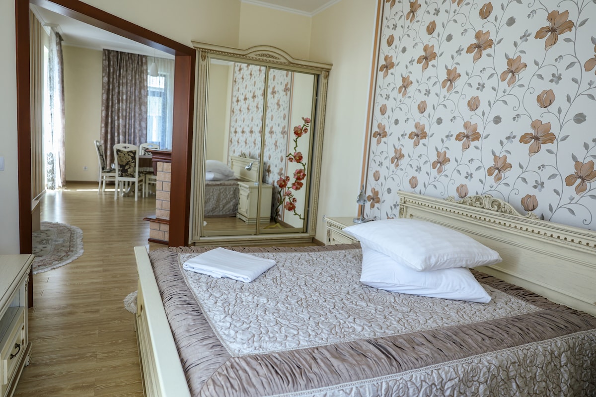 Koppla av på ett mysigt och stilfullt ställe. Här kan du glömma vardagens liv och rörelse i kombination med de pittoreska bergen och den rena luften. Skönheten i bergen kommer att förtrolla dig vid första anblicken och du kommer att vilja komma tillbaka till oss om och om igen) vi har ett stort plus eftersom det inte finns några turister i närheten, och du kan njuta av resten, eldstaden på en kall kväll kommer att värma dig och skapa en oförglömlig atmosfär) och vi har också alla möbler gjorda av naturlig valnöt som ger en otrolig atmosfär, vi väntar på dig!)