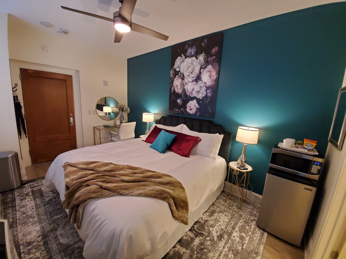 Ett mysigt och ljust rum beläget på The Reserve vid 4th and Race i hjärtat av centrala Cincinnati. Du är en kort promenad till många restauranger och nattliv. Denna historiska byggnad byggdes 1927 och omdesignades 2012 för att inkludera 88 lägenheter, ett fitnesscenter och en takterrass. Detta privata rum är ett pittoreskt utrymme som har en dubbelsäng, badrum, skrivbord, tv, internet, minikylskåp, mikrovågsugn och ett SmartLock som endast fungerar med din kod under din vistelse. Parkering är extra.