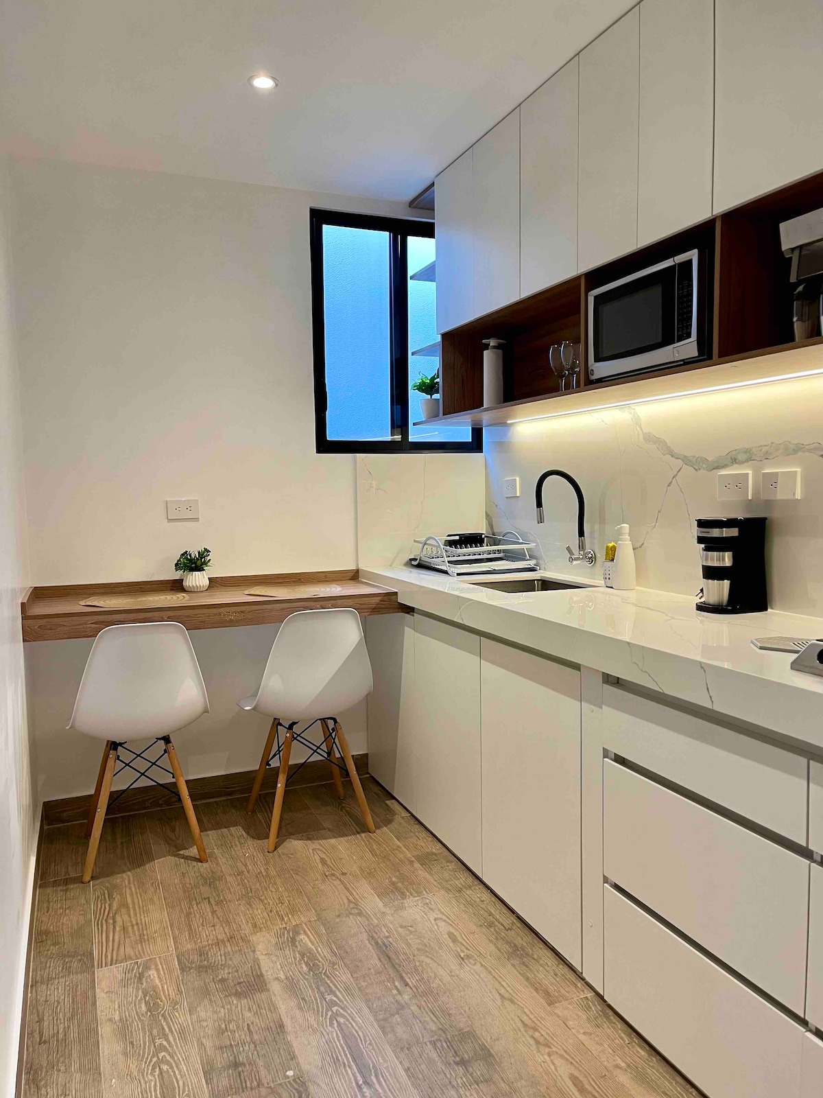 Lägenheten har totalrenoverats. Vitt är den dominerande färgen i lägenheten vilket ger känslan av amplitud och frihet. Inredningen är minimalistisk, med trä som ytor på golvet, teakdörrar, sängar och nattduksbord. Utsikten är fantastisk med utsikt över Santa Ana Hill, Guayasfloden och staden. Det finns reception dygnet runt i byggnaden, och övervakningskameror överallt, mycket säkert område och byggnad.