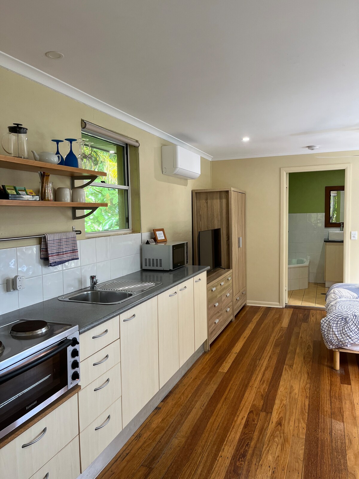 Ta en paus och varva ner i denna fridfulla oas. Vår Studio Spa har ett spabad i badrummet och en bastu på däcket Vi har en vistelse på minst 2 nätter, men om vi kan ta emot dig runt andra bokningar kommer vi att göra det. De luftkonditionerade stugorna är omgivna av tropiska trädgårdar med rikligt djurliv (inkl. kängurur). Koppla av i våra vackra omgivningar eller utforska de lokala omgivningarna! 100 % djurvänligt, en avgift på 15 USD per djur och dag tillkommer Vår fastighet består av 5 fullt fristående stugor.