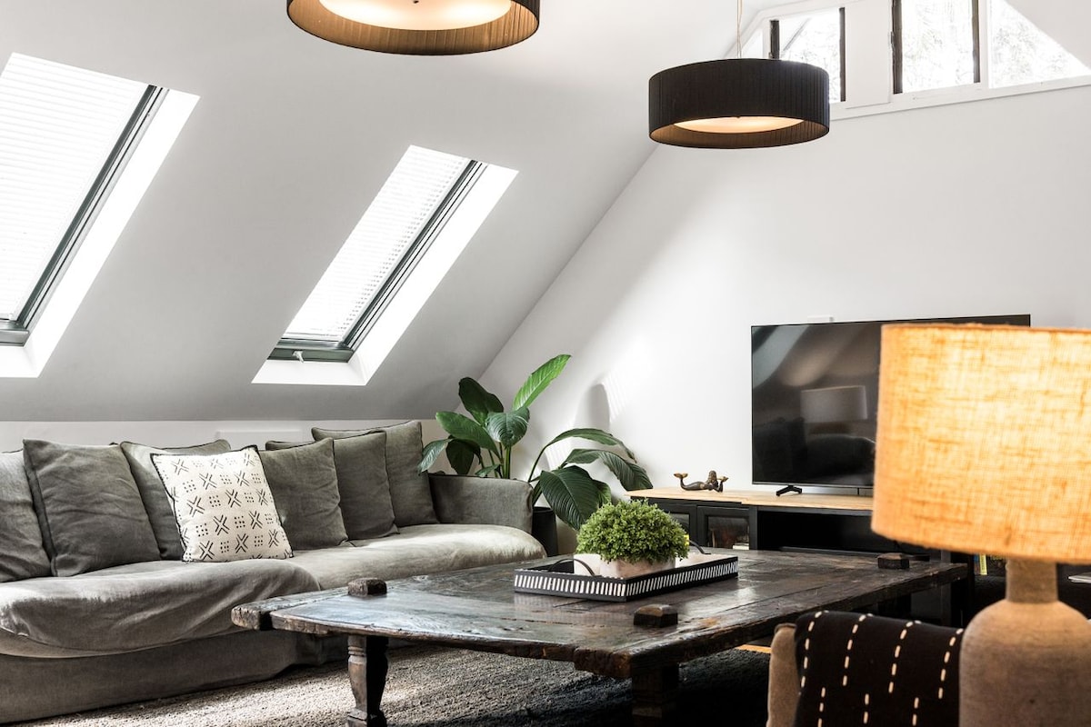 Elbilsladdare finns tillgänglig mot extra kostnad Loftet skryter med exceptionellt högt i tak, exponerade takbjälkar och är unikt arkitektoniskt utformade. Två våningar golv till tak glas med utsikt över trädgårdar Alla ursprungliga konstverk . Ett toppmoderna kök, ett utomhusdäck, med grill Utrymmet har en avkopplande atmosfär med balinesisk styling ,utomhus stenbad och dagssäng som gör att du får koppla av. The General cafe at the end of street Fastighetsförvaltare bor i närheten