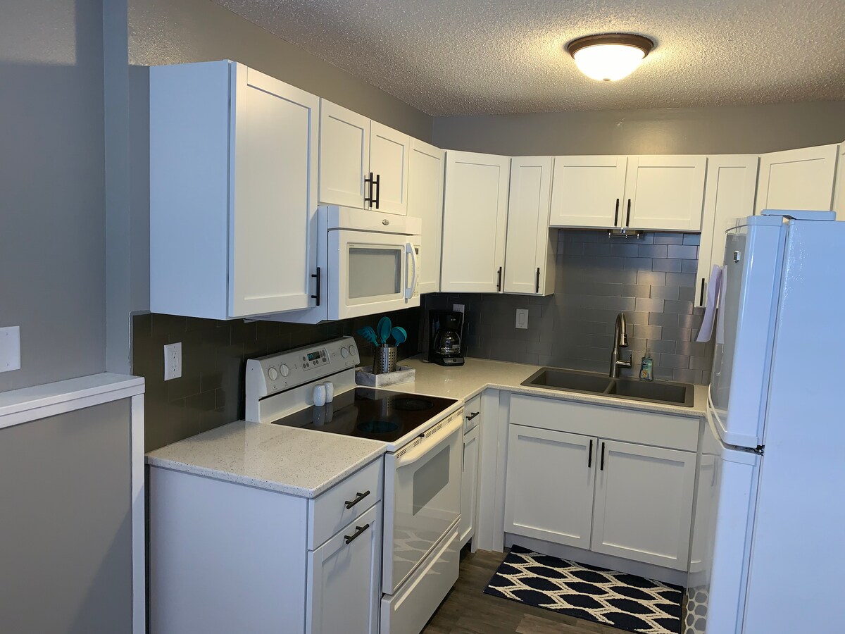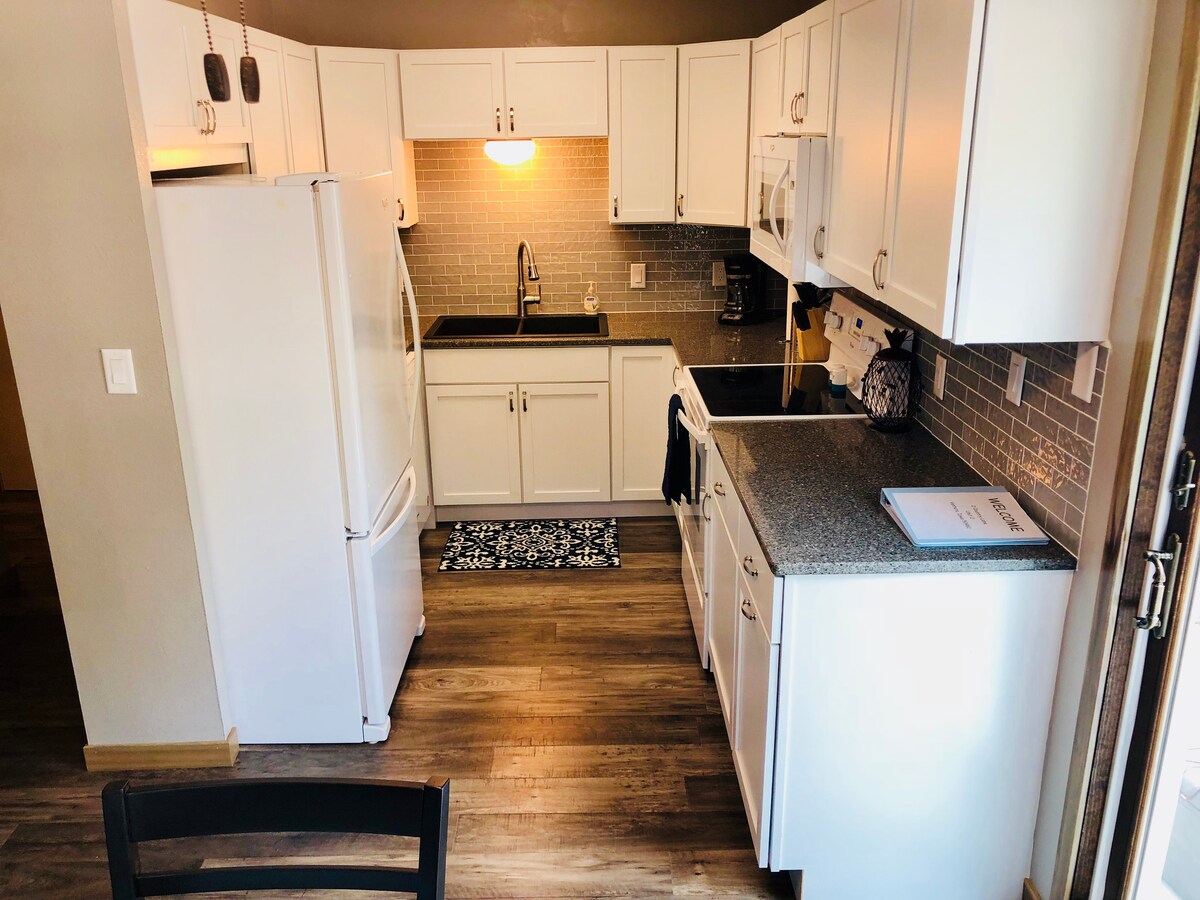 Din familj kommer att ha nära till allt när ni bor i detta centralt belägna boende. Denna mysiga lägenhet ligger bara några kvarter från flera parker, pool, promenadvägar, den NYA isarenan och centrum. Sjukhuset ligger bara 5 minuters bilresa bort. Sovrummet har en bekväm dubbelsäng, byrå och garderob. Badrummet har badkar/dusch och andra bekvämligheter. Du kommer att ha allt du behöver för att göra och njuta av en god måltid om du väljer att stanna kvar. Vardagsrummet har en 43 tums tv och en stor bekväm soffa med en bäddsoffa