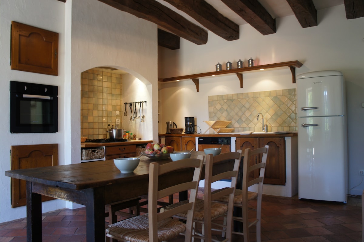 På området för ett tornigt 1400-talsslott — som finns i ett antal hem- och inredningstidningar — ligger detta vackert omvandlade, rymliga, tidigare stall i härliga trädgårdar med utsikt över vår 10 hektar stora tryffelfruktträdgård. Fullt av karaktär och charm, tjocka lokala kalkstensväggar håller huset svalt på sommaren men ändå mysigt under de kallare, tryffeljaktmånaderna. Den täckta terrassen är perfekt för alfresco matlagning och har en oavbruten utsikt över trädgården.