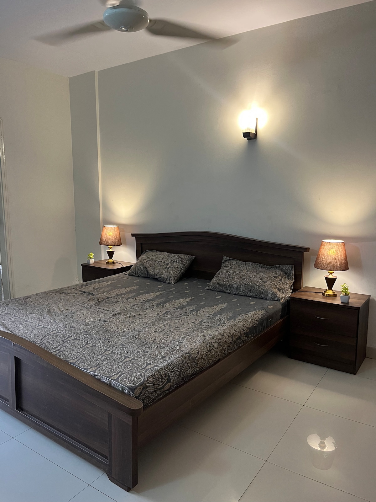 Unwind with Your Family in Our Serene 3-Bed Apartment Escape to our cozy 3-bedroom apartment. - 3 Spacious Bedrooms: 2 master bedrooms with king-sized beds, AC, and smart TVs. One room has a stylish dressing area, third room has single bed, cupboards, Iron stand, dressing table & no Ac. - Amenities: Attached washrooms, 3 shaded LED lighting. - Drawing Room: 5-seater sofa, attached washroom. - Kitchen: Spacious American-style with dining table and brand-new appliances. Unit on 2 floor no lift