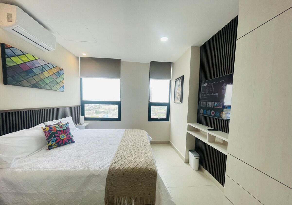 Perfekt boende för ditt nästa besök i Mountain City! Fantastisk lägenhet belägen i ett privilegierat område, precis framför Parque Fundidora, Arena Monterrey och Citibanamex. Det har utsikt över Cerro de la Silla, och ligger i en nybyggd byggnad, där du kan njuta av moderna bekvämligheter såsom gymnasium, grillar, festrum, affärscenter. Depa är bekväm, ren och säker. Tillägnad människor som njuter av en minimalistisk och elegant design.
