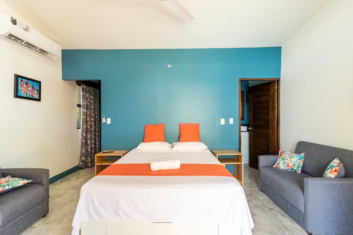 En studio av en uppsättning på 7. Studion är utrustad med allt du behöver för att göra din vistelse underbar. Blue ligger på översta våningen, så du måste klättra uppför en trappa. Steg från stranden, stormarknader, restauranger, men tillräckligt privat för att du ska känna dig bekväm! Varje studio har luftkonditionering, varmvatten, 100 mbps wifi fiberoptik, skrivbord, privat badrum, kök och balkong! Vi har en vacker saltvattenpool och grillplats. Kolla in Magic Place ROSADO, AZUL, MORADO, GRIS, BLANCO, VERDE om vi är fulla!