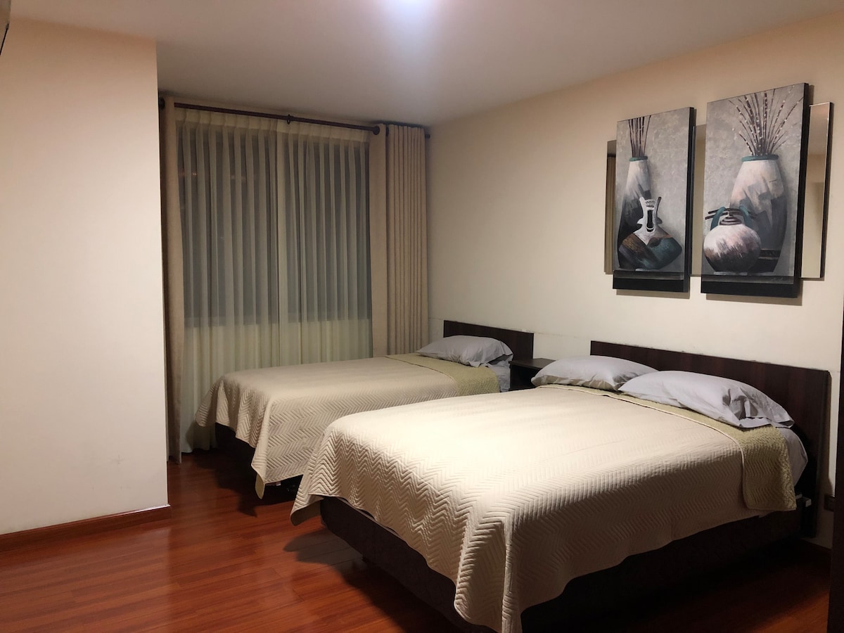 Rymlig och ljus lägenhet, den har 1 svit med en dubbelsäng och 1 sovrum med två sängar och ett extra badrum. Det är perfekt för personer med distansarbete, familjer eller grupper av vänner som vill spendera en trevlig vistelse i Cocha i en modern vintagestil. Köket är utrustat om du föredrar att laga något. Byggnaden har säkerhet dygnet runt, gym, pool och bastur. Närliggande Lincoln Park är ett vackert grönområde för att få kontakt med naturen och/eller motionera.
