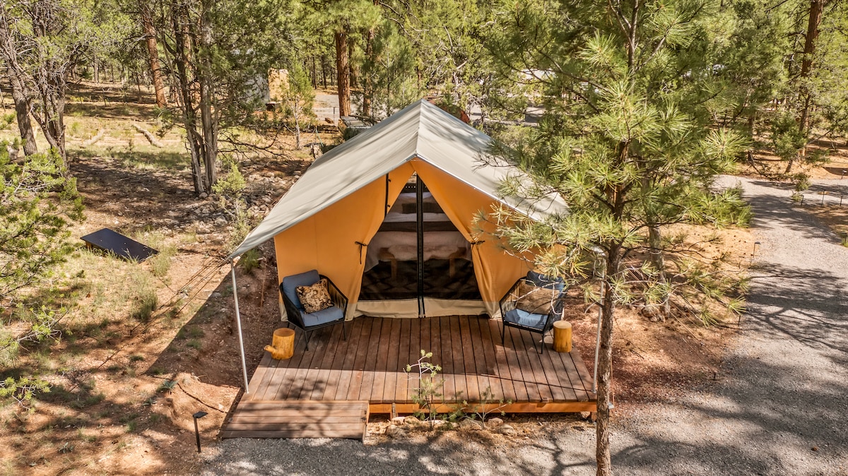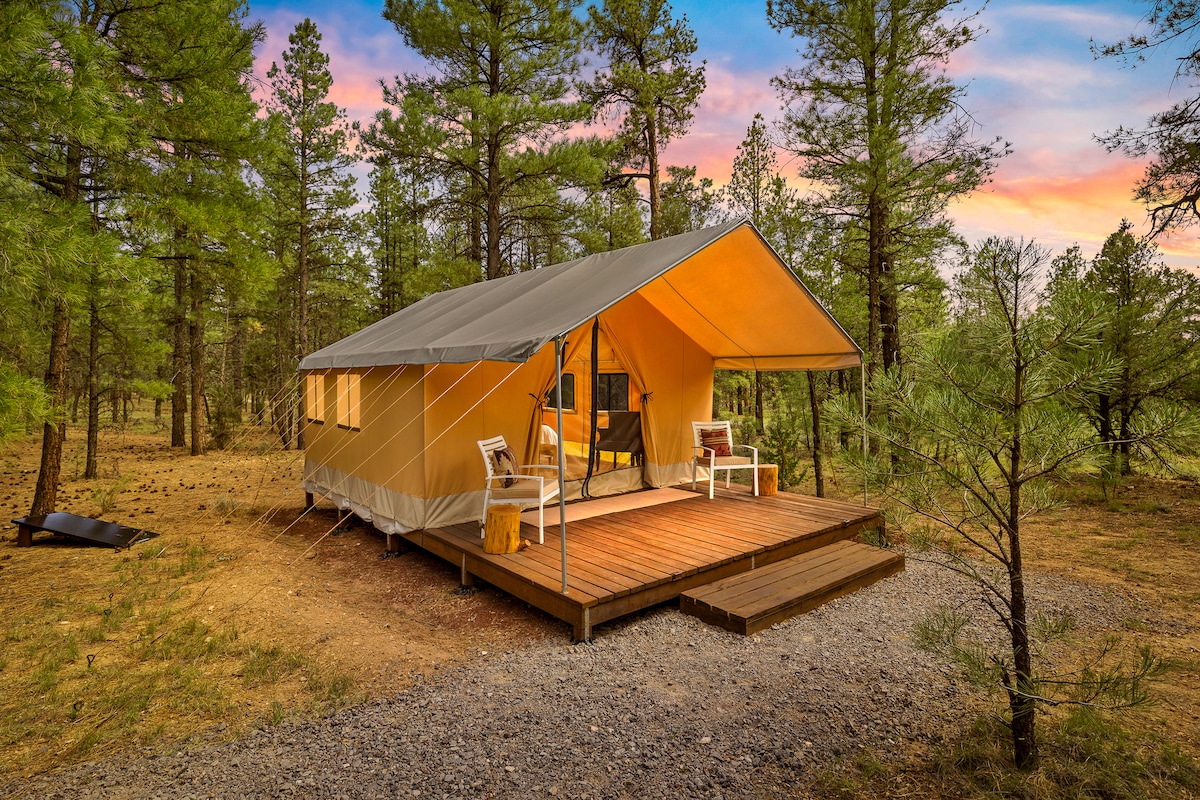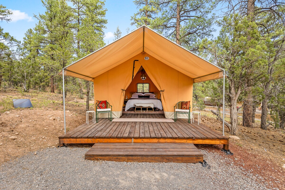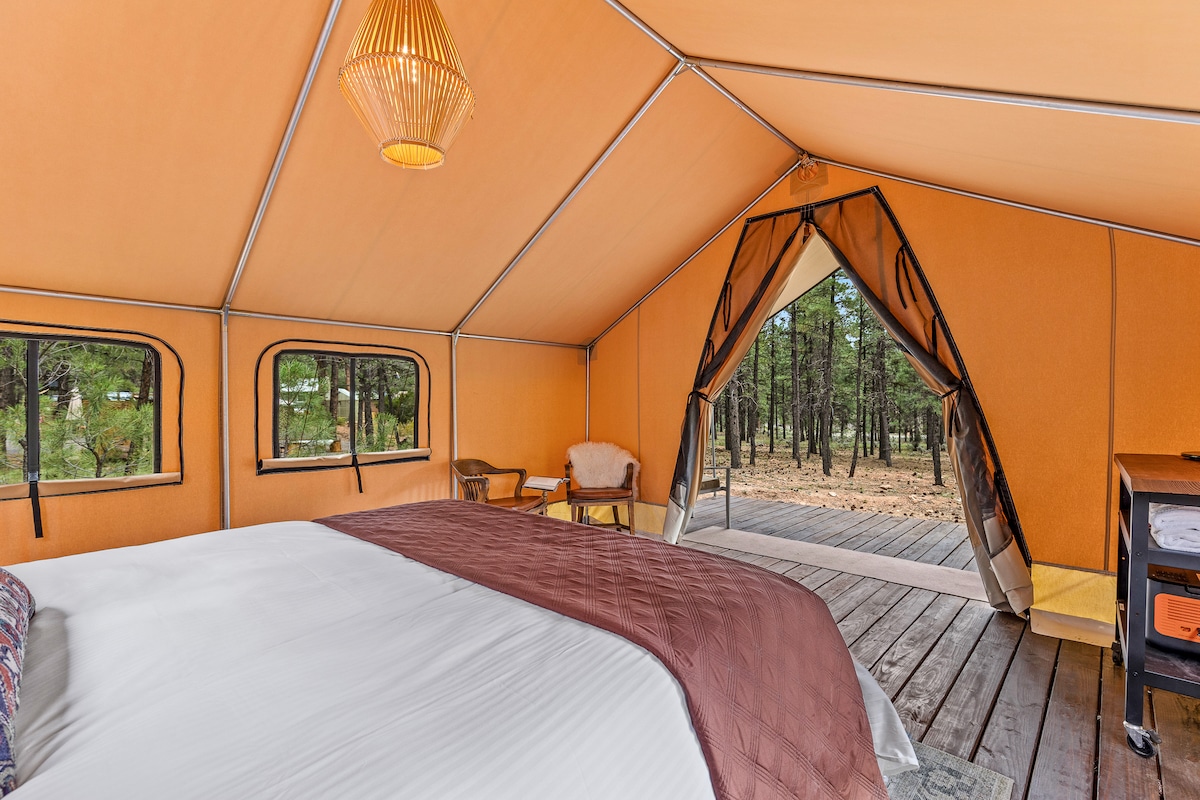Luxury glamping near Grand Canyon, featuring panoramic views, plush king size bed, en-suite bathroom, sofa bed, heat, A/C, robes, mini fridge, and coffee maker. Glass fronted with a private deck and parking. Unique eco-resort with a farm to table restaurant, spa, yoga, miles of nature trails, fire pit with s'mores, horseback riding, lake with beach, kayaking, paddle-boarding, snowshoeing, cross country skiing, and fishing. Pet friendly