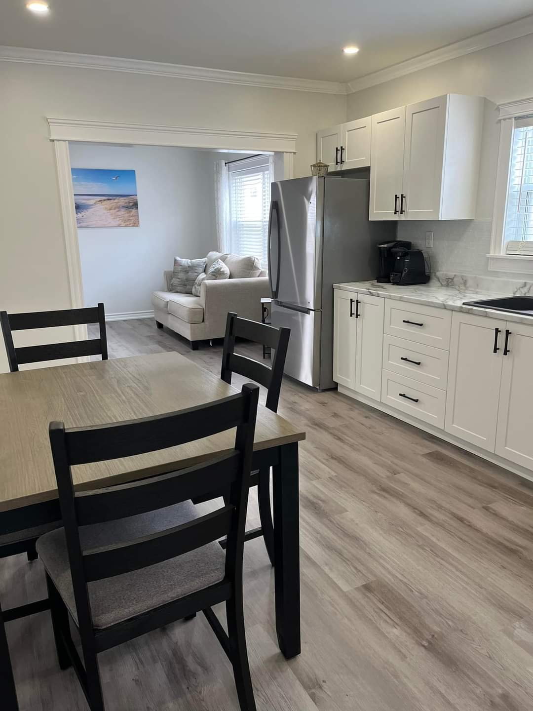 Enjoy a stay in our suite. Just a few minutes from the ferry. Our suites have fully equipped kitchens and dining room tables. So you can prepare your own meals. We supply pots, pans, utensils, dishes, glasses, and cuttery. We even supply the dish soap! You will also find the comforts of home like a keurig machine with coffee/tea, kettle, microwave, toaster, and even air fryer