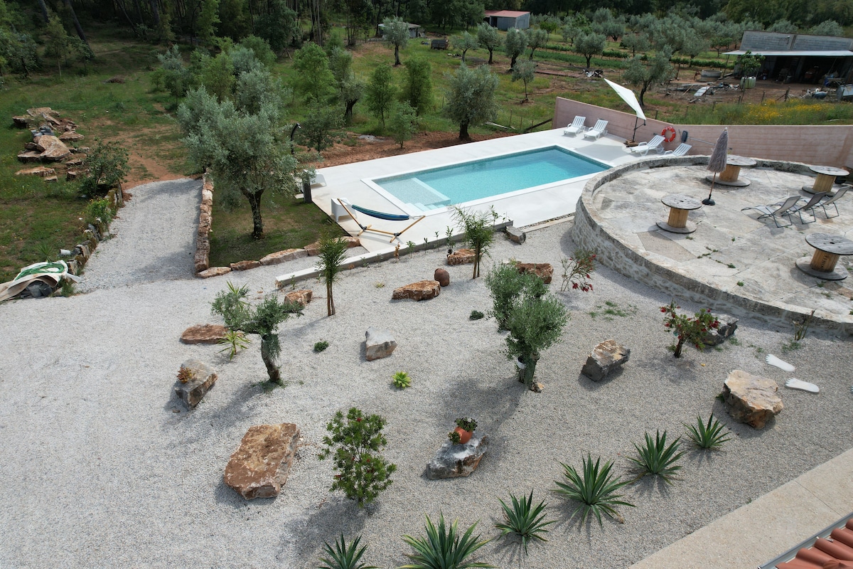 Rymligt fristående hus med stort fönsteröppning till den privata terrassen och trädgården och gemensam pool. Den har ett fullt utrustat kök och ett separat sovrum med terrass med utsikt över bergen och dalen. Det finns också 2 enkelsängar i vardagsrummet. Isolerad med kork och trä, har golvvärme, öppen spis och forcerad varm eller kall luftventilation. Sängkläder och handduk för den valfria spjälsängen kostar 10 € extra per natt.