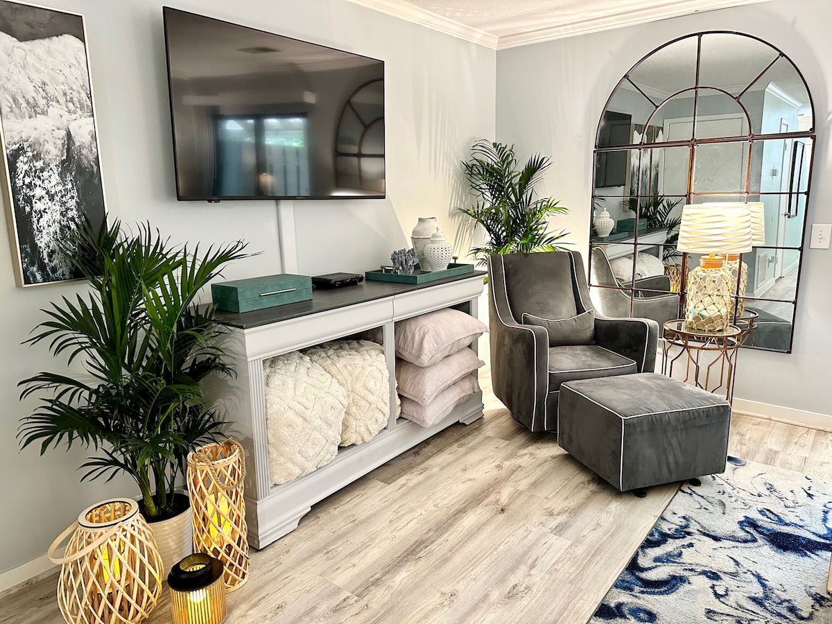 Bo bara några minuter från stranden och Coligny Plaza i denna mysiga lägenhet på första våningen. Njut av ett renoverat badrum, ett fullt utrustat kök med tvättmaskin och torktumlare och en Keurig för ditt morgonkaffe. Gemenskapen har både inomhus- och utomhuspooler – uppdaterade 2025. Vår enhet är den perfekta hemmabasen för att utforska allt Hilton Head Island har att erbjuda. Detta är A-enheten i en lockout-lägenhet; B-enheten kan vara upptagen under din vistelse, men båda är privata och separat åtkomliga.
