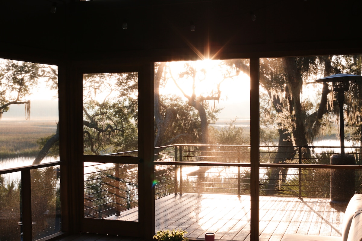 "Det mest unika och avkopplande stället att njuta av lugnet och upplevelsen av Edisto. Vi ville inte åka därifrån" - Sambo Beläget ovanpå 360-graders träskutsikt, kommer du att fördjupa dig i den exotiska naturliga skönheten och djurlivet på Edisto havsö. Hör vågorna krascha på stranden från verandan och se träsketidvattnet stiga och falla från ditt val av de många verandorna. "Natur med lyx.. vår grupp älskade att flyta från huset ut till inloppet för privata stranddagar" - JP