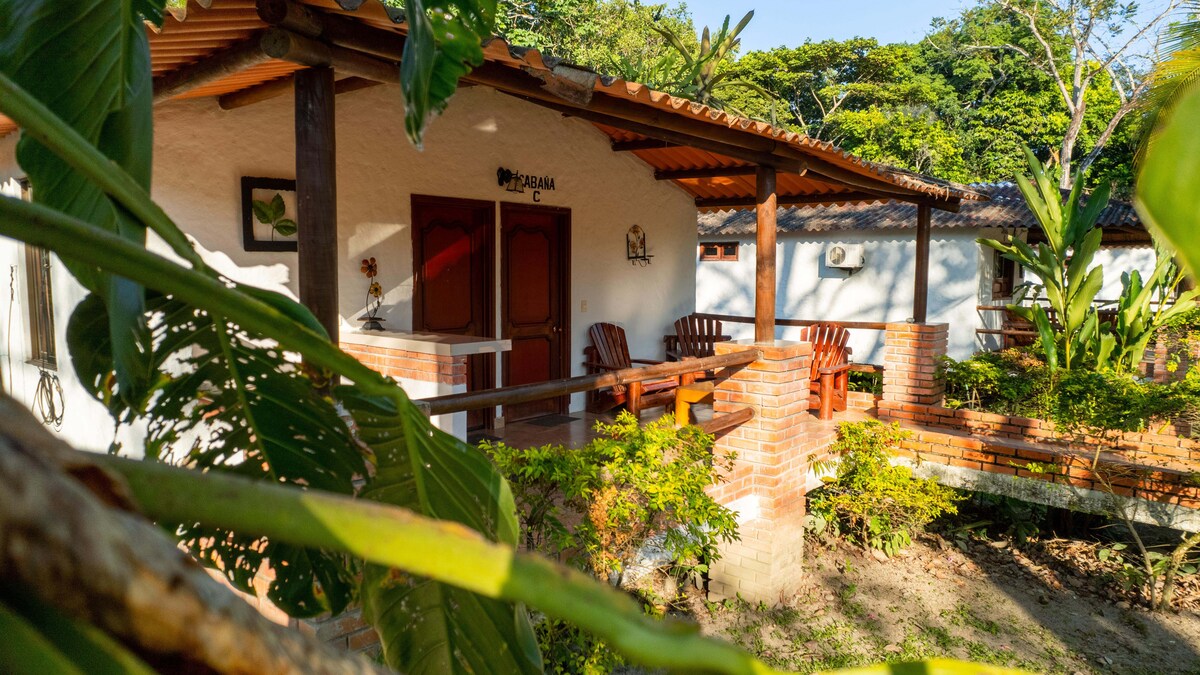 Njut av en rymlig bungalow med uteservering mitt i en vacker plats, Entre Bosques Tayrona. Privat pentry. Starlink höghastighets-WiFi. Trädgård som omger bungalowen. Ekoturismgården har pool, restaurang, leder och bäck och ligger bara en halvtimmes promenad från stranden eller 10 minuter med bil.