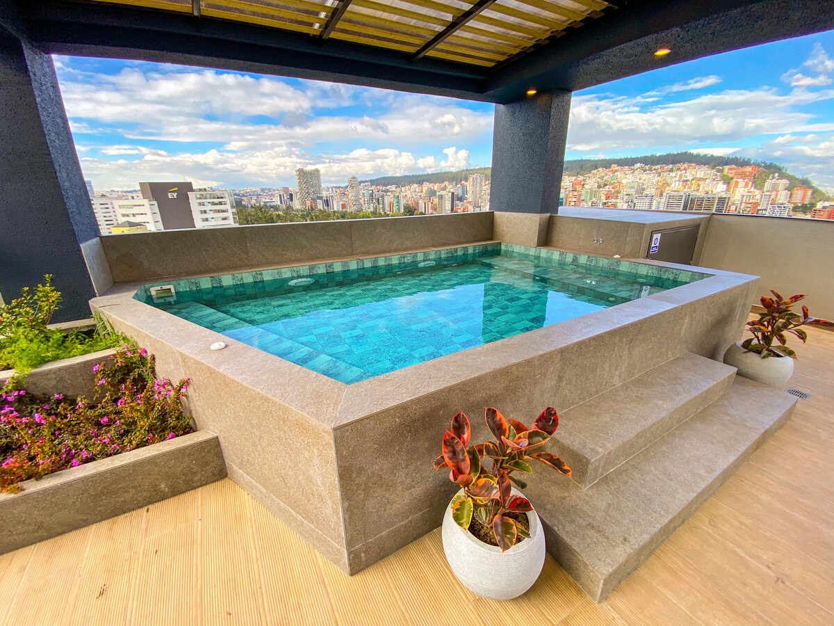 Njut av det bästa läget i Quito – en modern och mysig lägenhet framför La Carolina park. Perfekt för familjer, chefer och resenärer som söker bekvämlighet och omedelbar tillgång till det bästa i staden som restauranger, tunnelbanestation och köpcentra. - Wifi - Netflix - Disney+ - Strykjärn - Hårtork - Tvättmaskin och torktumlare - Varmvatten - Fjärrkontrollgardiner Gym - Jacuzzi (bokning krävs, fredag eller lördag 15 USD extra) - En biograf - Parkering