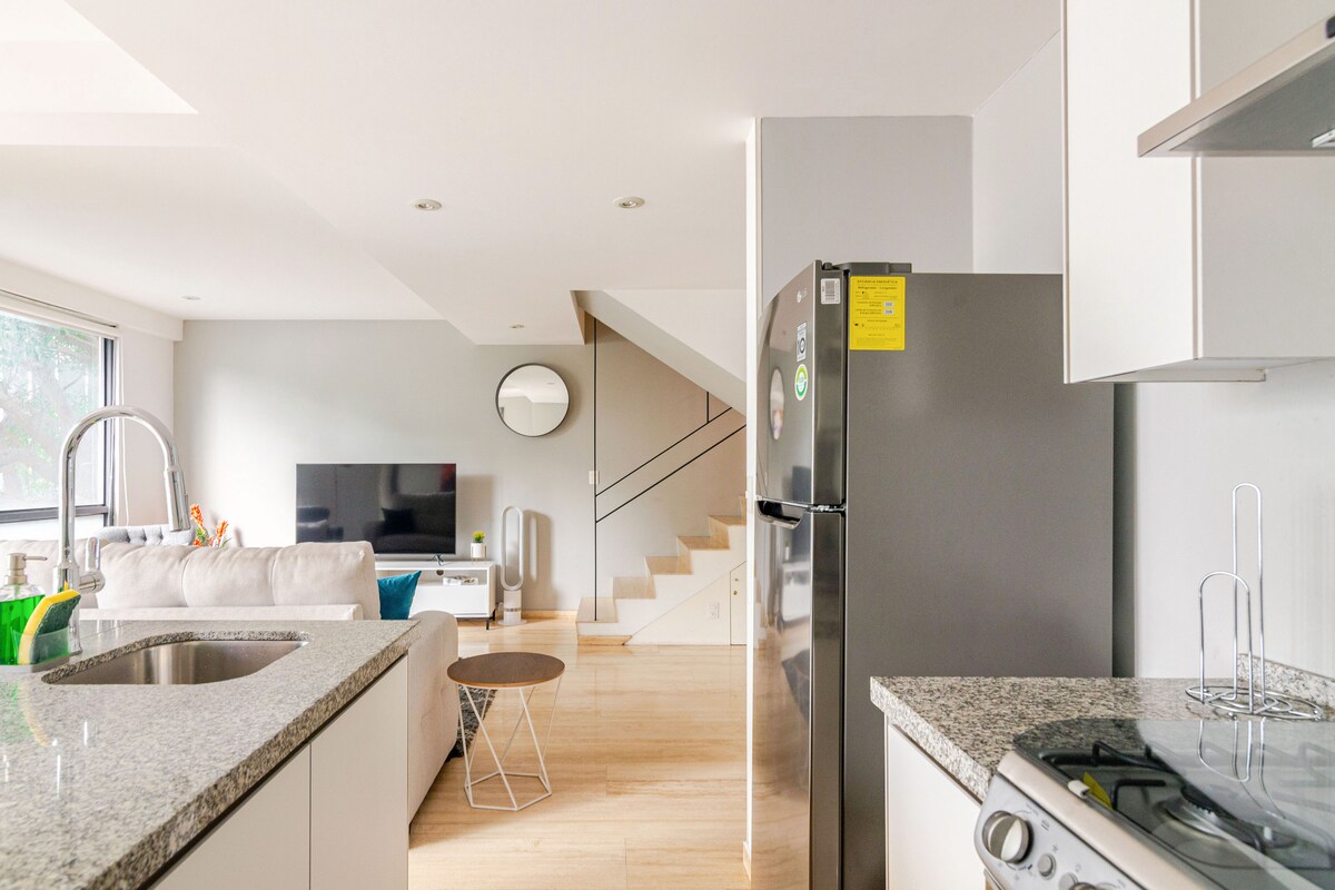 Upplev trendiga Nápoles, bara några steg från WTC och Pepsi Center, en snabb 7 minuters bilresa till Condesa och Roma, och bara 7 mi (11 km) från Benito Juárez International Airport (MEX), GNP Stadium och det spännande Formel 1 Grand Prix. Denna eleganta lägenhet på två nivåer har en privat balkong, en bekväm dubbelsäng, en bäddsoffa, en 60-tums Smart TV, ett fullt utrustat kök och höghastighets WiFi. Boka nu för att njuta av sofistikerad komfort i Mexico Citys bästa läge.