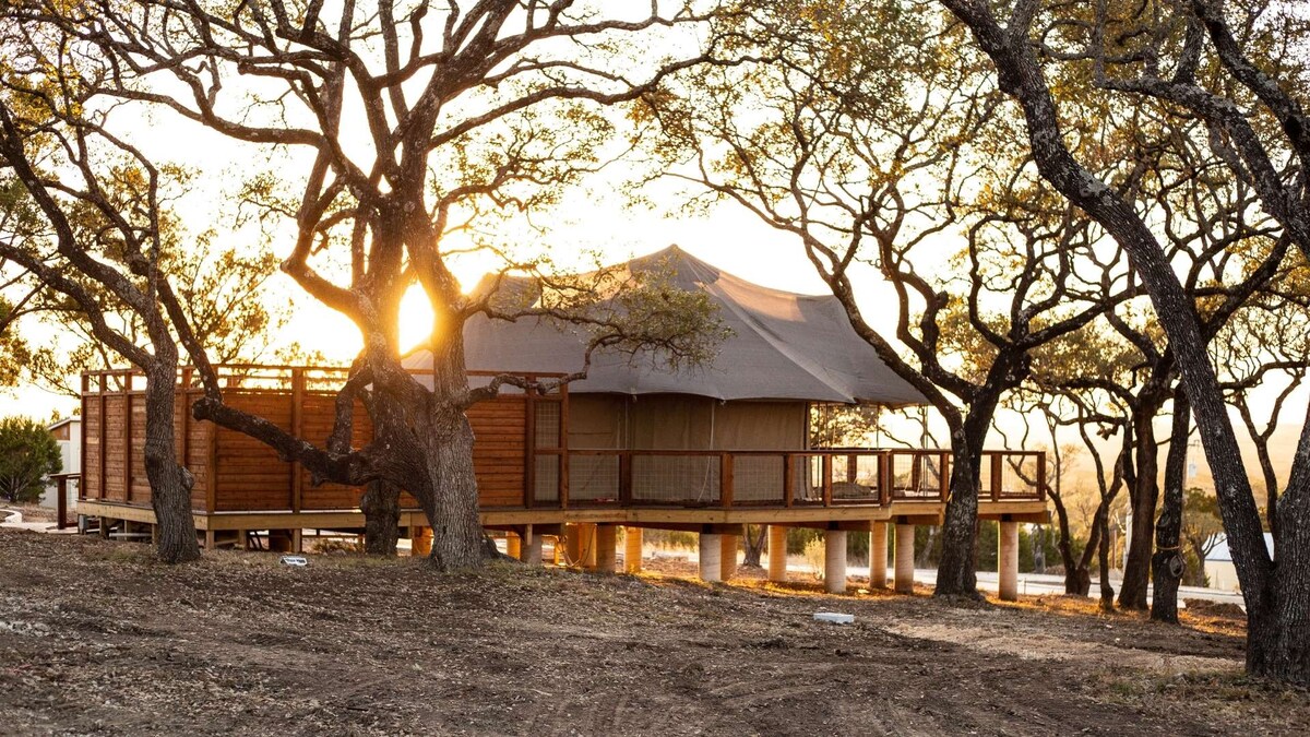 Whether you're looking for a romantic escape or a girls-only getaway, you've found the perfect place in this Authentic African Safari Tent with (AC and heat) set on a hillside in Wimberley only minutes to Blue Hole or downtown! Dreams await in the king-size bed, soft Comfy Brand sheets, and plush pillows. Custom-designed chandeliers, leather seating, private pool, soaking tub, blackstone grill and all the fun details make this space one of a kind.