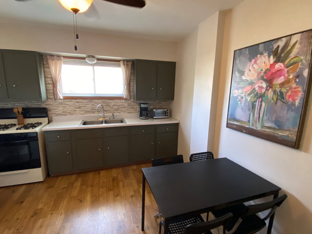 Ett rabatterat pris för vecko- och månadsbokningar. Om du planerar att stanna längre än en månad kan ett specialpris ges. Njut av hela lägenheten med alla bekvämligheter du är van vid hemifrån. Boendet är mycket rent. Njut av din egen ingång och parkering. Vardagsrummet är utrustat med skinnsoffa, stor skärm-TV och öppen spis. Det finns ett komplett badrum med fullt badkar och dusch. Sovrummet har en dubbelsäng