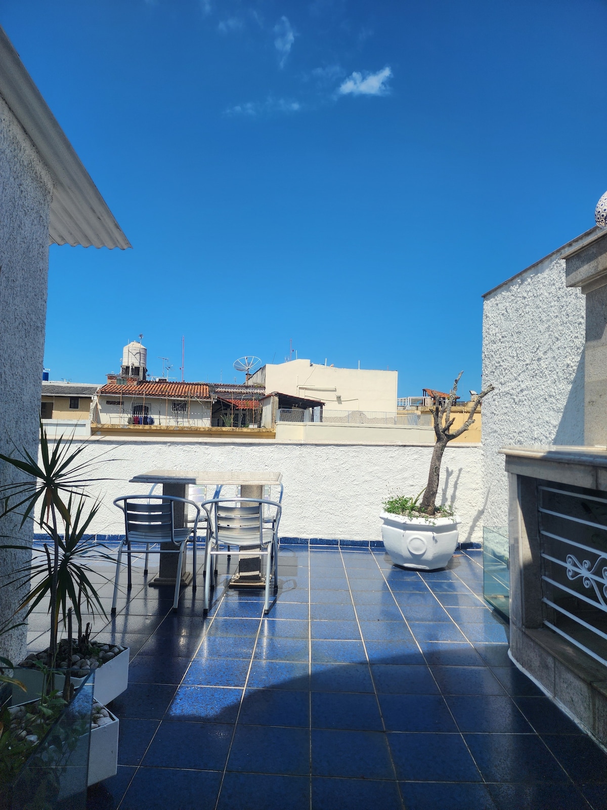 Vacker horisontell takvåning på en historisk gata i Flamengo. 2 sovrum/2 sviter, 1 kontor som kan omvandlas till ett sovrum. Jacuzzi och elektrisk grill i utomhusområdet. Luftkonditionering i alla rum. 5 minuters promenad från tunnelbanestationen Flamengo. 8 minuters promenad från Flamengo-stranden. 1 parkeringsplats.