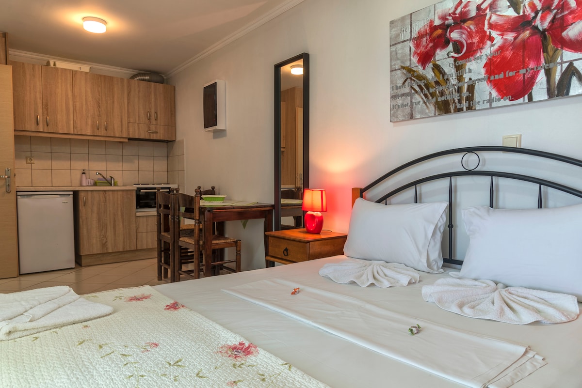 Nyligen byggd privat bungalowstudio, som erbjuder magnifik utsikt över öarna Paxos-Antipaxos och Korfu! Studiolägenheten är oberoende och har en egen terrass. Det ligger bara några meter från poolen! Det har en dubbelsäng, fullt utrustat kök och privat badrum.