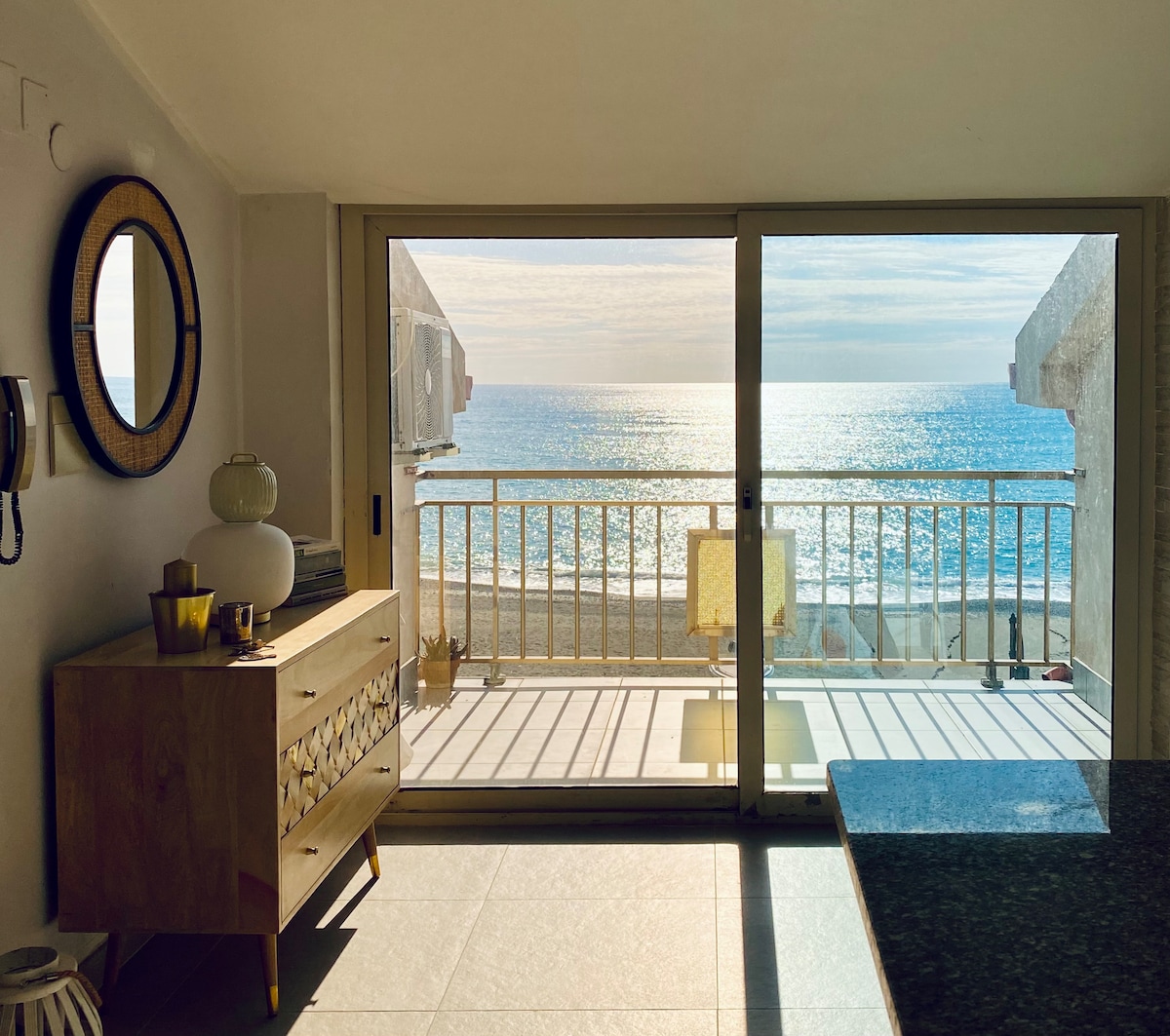 Varje morgon går solen upp direkt från havet framför huset, vilket ger ett naturligt skådespel som lyser upp varje hörn av lägenheten. De första solstrålarna tränger sig försiktigt in genom fönstren, filtreras genom gardinerna och smeker möblerna med ett varmt, gyllene ljus. Det är ett ögonblick av total frid: det dansande vattnets reflektion på väggarna, doften av havet i luften och känslan av att tiden stannar.