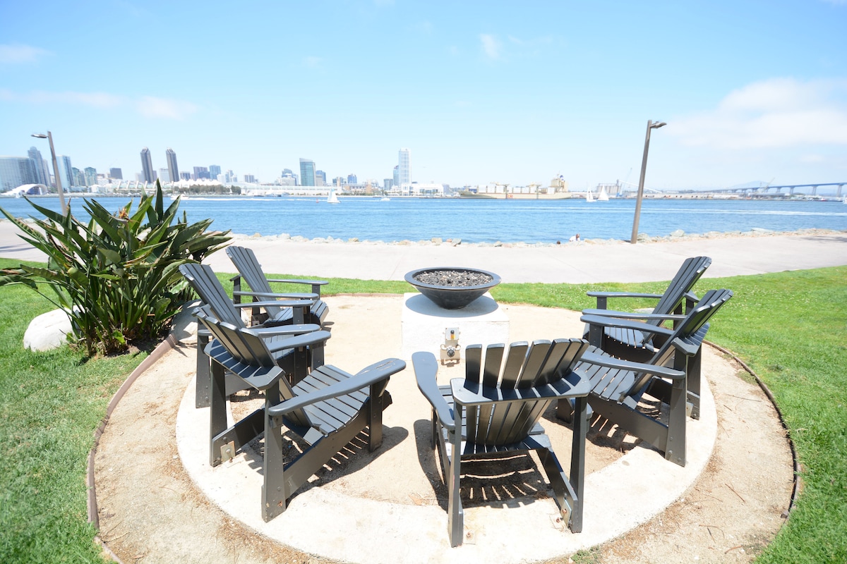 Brand New FAMILY Villa with Water Views from the kitchen / living area! Special reduction for week long stay!! Two level Villa. Large deck attached. Hot Tub, Barbecue Grill, Fire pit! Beautiful sunsets!! Come stay with us and enjoy all of San Diego's finest. We are located close to Balboa Park, Coronado and so many great venues and experiences or just stay on site and enjoy your very own Oasis!
