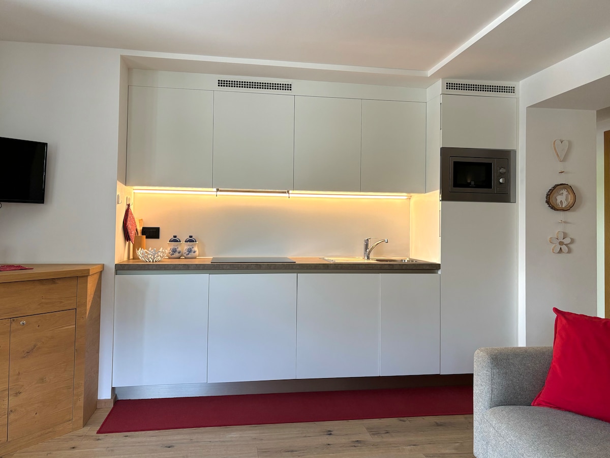 Grazioso appartamento di 40mq, appena ristrutturato, con interni in legno sia tipici che moderni con pavimentazione in parquet completamente nuova. Posizione ottima a 7/8 minuti a piedi dal centro di Corvara e collegamento rapido agli impianti sciistici tramite skybus gratuito a 100 m da casa. 38 km da Cortina, raggiungibile con auto (45 minuti) o bus. No fumatori.