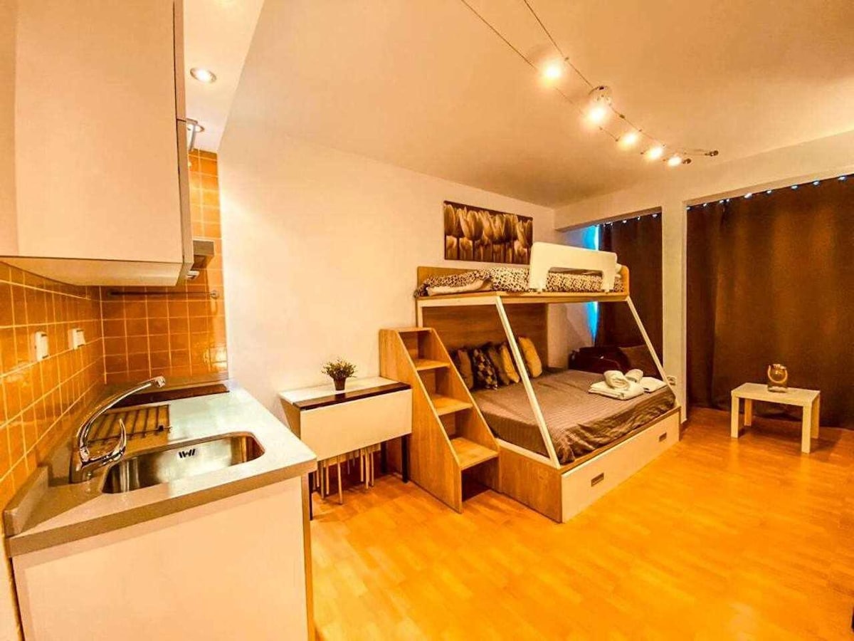 Vacker studio bredvid Almerias promenad 50 meter från stranden. Fullt utrustad, ny släppta möbler, perfekt för semester. Mycket ljust, i ett mycket lugnt område. Cafeterior, stormarknad och alla nödvändiga tjänster kan nås till fots. Hela lägenheten är nybyggd, nästan premiär. Tveka inte om du vill tillbringa några dagar med att koppla av i Almeria. Detta är din lägenhet.