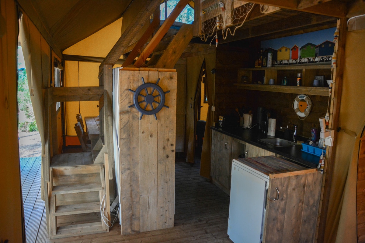 På en liten campingplats för hemvistelse är detta utrustade tält unikt och har ett eget utrymme. Utrustad med ett kök, två sovrum med bekväma sängar och ett vardagsrum, har en 10 m2 markis och en egen torr toalett. Utrustad med el, och dricksvatten är tillgängligt efter behag via en utomhuskran Riktig utomhusdusch med varmt vatten, rymligt och trevligt. Resten av bekvämligheterna delas med några husvagnar: utrymmen och tallrikar, skydd. Lungt ställe.