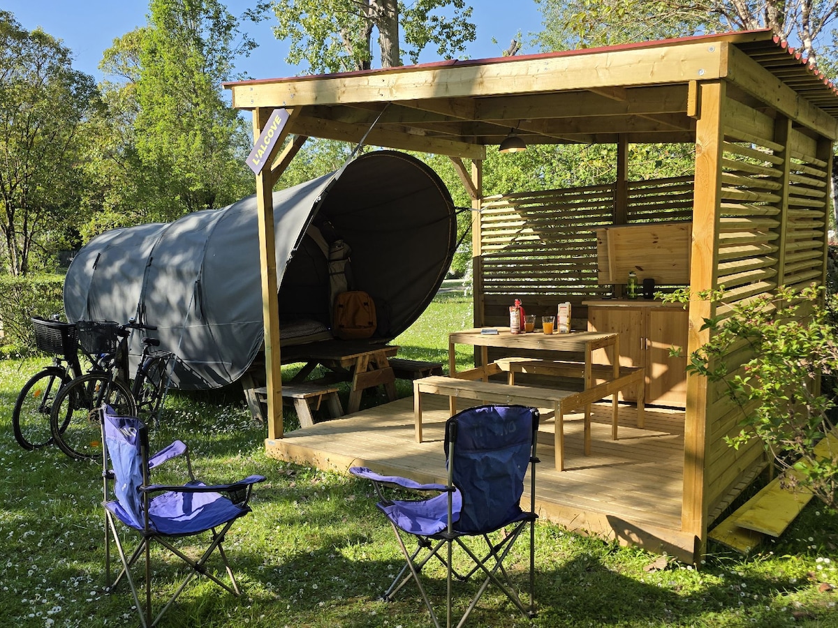 På en liten campingplats för hemvistelse är detta utrustade tält unikt och har ett eget utrymme. Utrustad med ett kök, två sovrum med bekväma sängar och ett vardagsrum, har en 10 m2 markis och en egen torr toalett. Utrustad med el, och dricksvatten är tillgängligt efter behag via en utomhuskran Riktig utomhusdusch med varmt vatten, rymligt och trevligt. Resten av bekvämligheterna delas med några husvagnar: utrymmen och tallrikar, skydd. Lungt ställe.