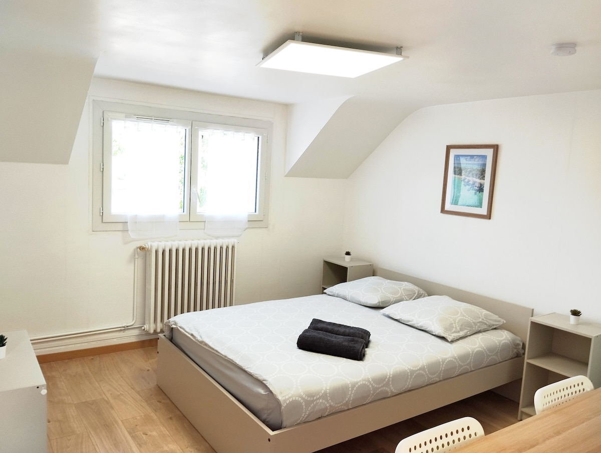 Trevlig studio i ett stort Melusine-hus, fullt av charm. Ditt soliga rum har utsikt över en vacker trädgård. I ditt privata badrum och pentry följer det århundraden gamla parkettgolvet duschkabin, sten och modern och konstnärlig design. Privat toalett på övervåningen. Handdukar och sängkläder finns. En 15 m2 avkopplingsplats väntar på dig i trädgården. Inom en radie av 200 meter, tågstationen, 2 restauranger, butiker och Historic Center.