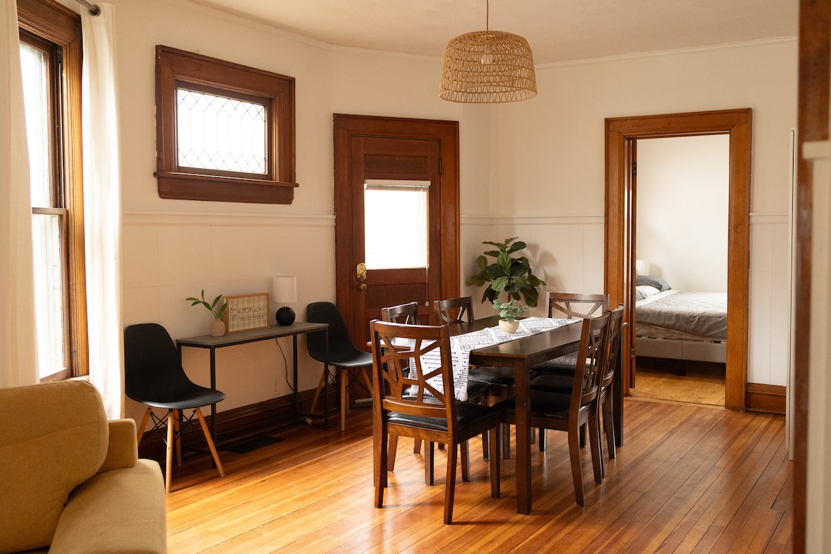 Our Little Boho studio on the top floor of a quiet 4-plex is the ultimate in modern comfort! Every detail is designed with luxury in mind, including a custom kitchen and bath, velvet drapery, and fine finishes. Relax in style with a plush king bed, full-size sleeper sofa, well-equipped kitchen, W/D, patio, and private parking. We are nestled in Little Bohemia, close to downtown, CWS, & the zoo. Enhanced cleaning and self-check-in ensure you're in good hands. Book now for an unforgettable stay!