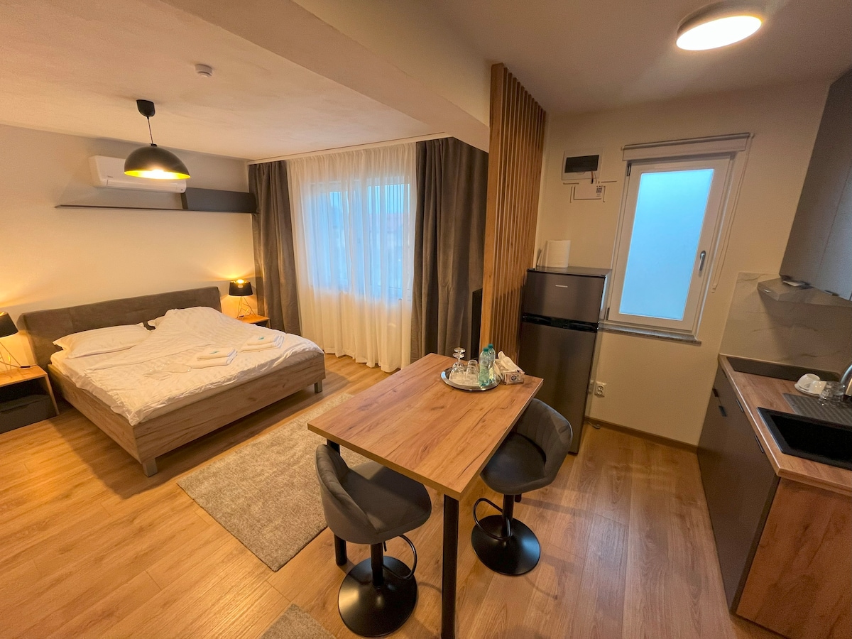 Välkommen till Erwins Studio Sky View, där komfort möter elegans! Denna rymliga 42 kvm stora studio erbjuder dig en fantastisk utsikt, perfekt för stunder av avkoppling. Varje hörn är genomtänkt inrett och inspirerar till en känsla av förfining. Perfekt beläget bara några minuter från stadens centrum, är det det perfekta valet för en urban semester. Här är våra gäster vår främsta prioritet, och varje besökare lämnar med fina minnen. Vi ser fram emot att välkomna dig för en oförglömlig vistelse!