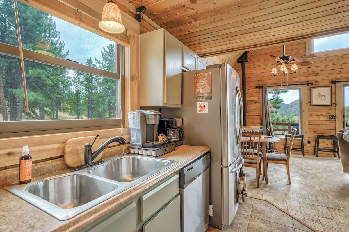 Vår mysiga stuga ligger på baksidan av Pikes Peak! Den här charmiga stugan är solig och undangömd i skogen och är ett bra ställe att koppla av, leka eller arbeta på distans. Steg bort från utsikt över Klippiga bergen. Vi ligger bara några minuter från fantastiska äventyr och flugfiske i världsklass. Uppsättning med öppen planlösning, välvda tak, vedeldad spis, ombyggt badrum, stort skrivbord och snabbt WiFi. Den bakre uteplatsen är perfekt för lövkikande, grillning och utsikt över solnedgången.