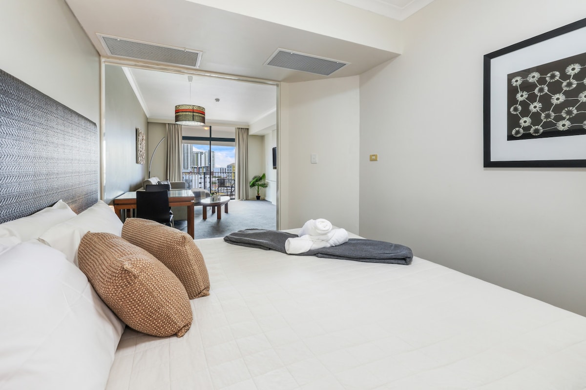 Vakna till soluppgångar i hamnen från denna eleganta CBD-lägenhet på 15:e våningen, två sovrum, några steg från vattnet, restauranger och stadens höjdpunkter – en idealisk bas för att utforska Darwin. Rymmer upp till 6 personer med en dubbelsäng, två enkelsängar (konvertibel till dubbelsäng) och en bäddsoffa. Varje sovrum har sitt eget badrum, och enheten är fullt utrustad med allt som behövs för en bekväm vistelse. Gäster har också tillgång till en pool på 6:e våningen, gym och säker parkering (max 2 m bilhöjd).