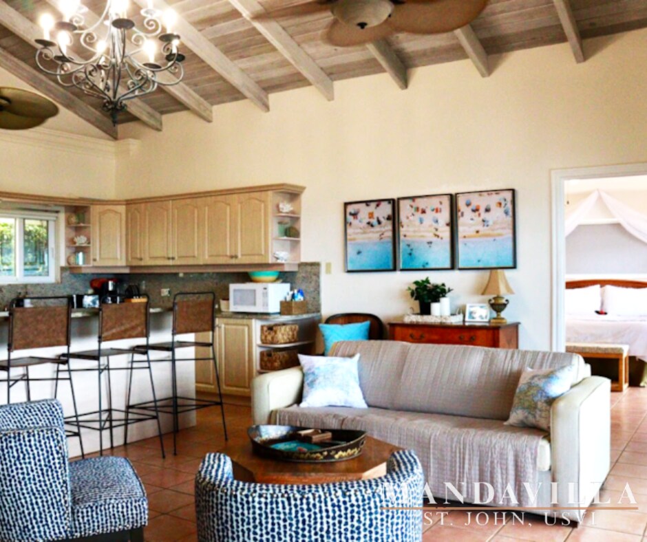 Escape to Mandavilla, a charming villa located on a hillside overlooking picturesque Cruz Bay. Designed for the perfect indoor/outdoor living experience, our villa invites you to be captivated by the breathtaking views. Immerse yourself in the island's charm as you enjoy the refreshing breezes throughout the villa. Enjoy stunning sunrises/sunsets right from your private terrace! Mandavilla is designed to provide comfort & connect you to the natural surrounding beauty.