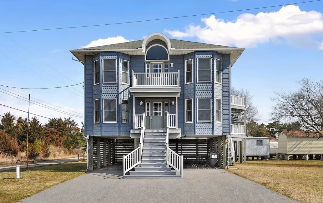 Fly till lugnet i vår tillflyktsort vid kusten med tre sovrum med utsikt över Delaware Bay. Vakna upp till de lugnande nyanserna av soluppgången och varva ner med hisnande solnedgångar. Med ett fullt utrustat kök, matplats och inbjudande vardagsrum, komplett med en TV, erbjuder vår tillflyktsort den perfekta blandningen av komfort och bekvämlighet. Gå ut på altanen för att äta mitt i buktens milda bris, eller titta på när högvatten graciöst flyter under huset och fördjupa dig i naturens lugn.