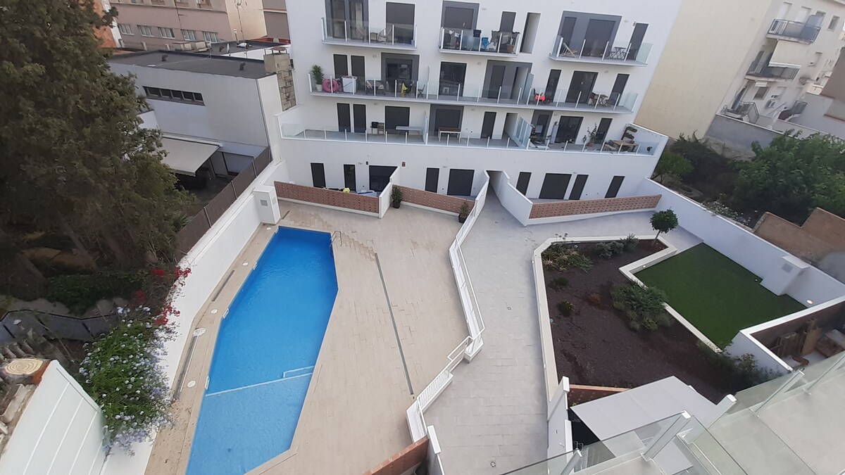 Lägenhet på stranden. Som ett trädgårdshus direkt till den lokala poolen. 2 sovrum, 1 dubbelsäng med utsikt över trädgården och 2 enkelsängar med utsikt över grönområdet med tallar. Mycket nära till restauranger, strandbarer, tåg, stormarknader, bredvid två stora stränder och en annan exklusiv strand för hundar. Det har wifi, luftkonditionering och värme.