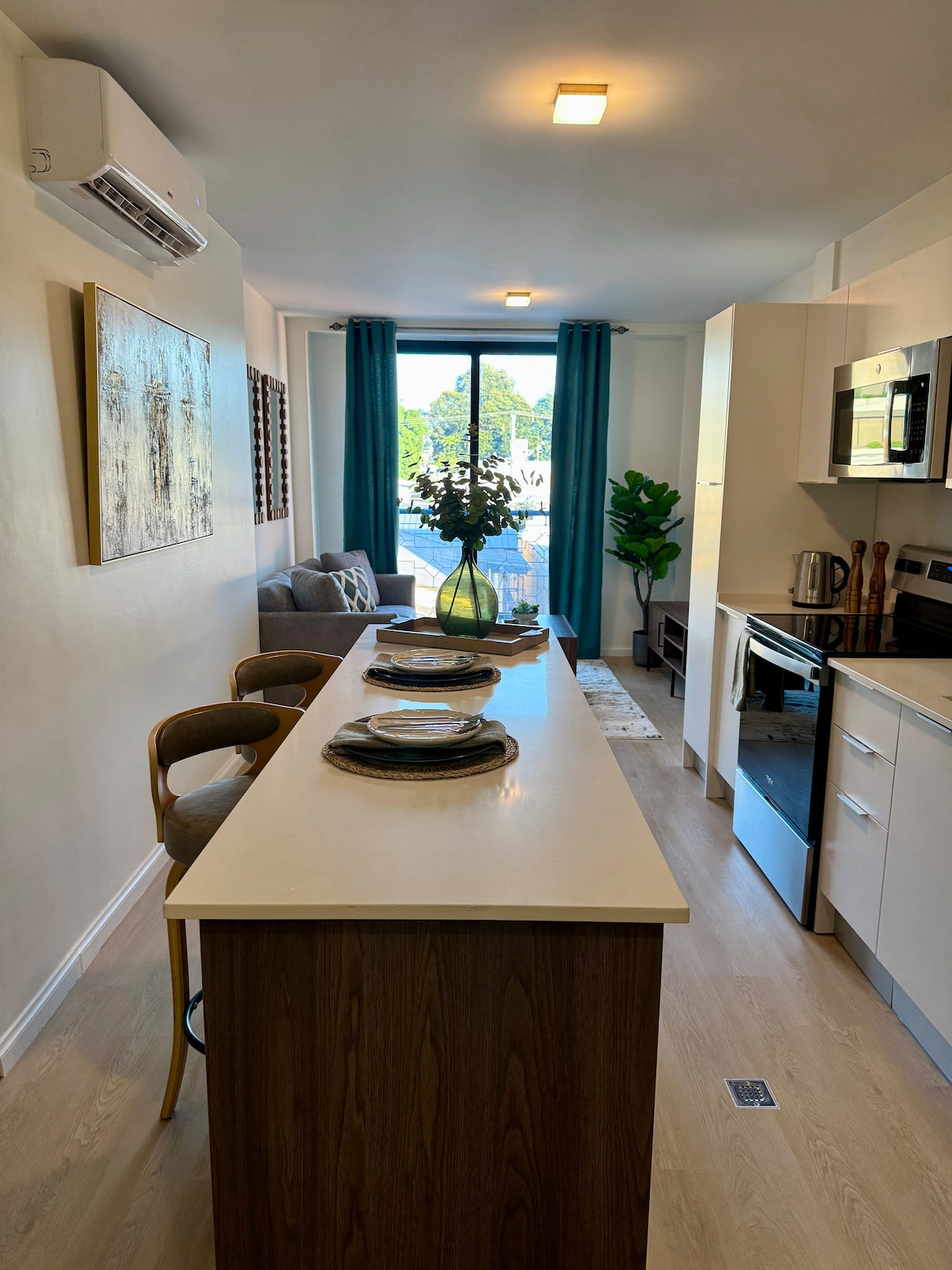 Välkommen till ditt hem hemifrån! Denna eleganta och rymliga lägenhet med 2 sovrum och 2 badrum erbjuder den perfekta blandningen av komfort och bekvämlighet, perfekt för familjer, par eller affärsresenärer. Utrymmet Koppla av i det öppna vardagsrummet med en mysig soffa, smart-TV och höghastighets-Wi-Fi. Det fullt utrustade köket har hushållsapparater i rostfritt stål, köksredskap och en kaffebryggare – perfekt för att äta middag. Glöm dina bekymmer i detta rymliga och fridfulla boende.