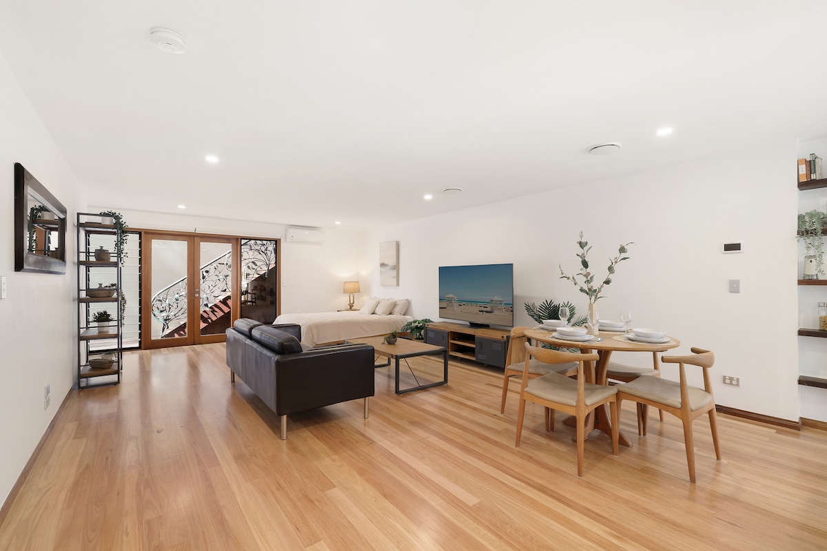 Modernt ombyggt dubbelgarage, med nyinstallerad luftkonditionering. Separat från huset men i närheten. Den har en privat dörringång längs vår utomhusgångväg och en skjutdörr som leder till vår uteplats/gård. Vi är glada att gäster kan använda detta område, men det är utrymmet mellan vårt hus och din studio så det kan delas ibland. Det har allt du behöver för en kort vistelse på Gold Coast!