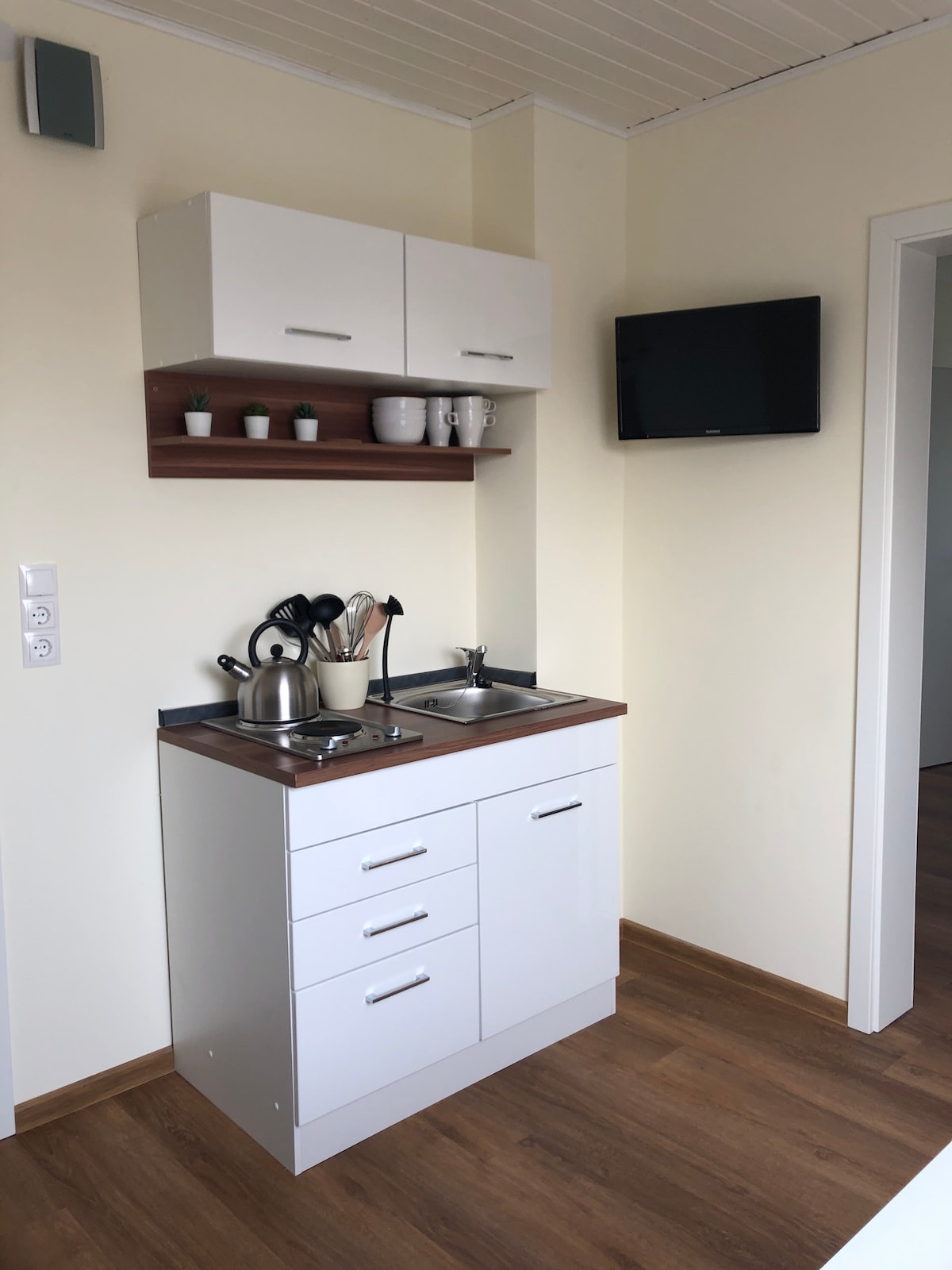 Vi byggde den blå villan för att göra människor lyckliga: Först våra barn och nu våra gäster, som njuter av den otroligt fridfulla atmosfären och den fantastiska utsikten över vinvägen. Lägenheten i källaren erbjuder 50 kvm boende för par som vill vara helt för sig själva. En kingsize-säng bjuder in till mys. Ett enkelt kök kompletterar den kärleksfullt utformade atmosfären. Under bladtaket av gamla ekar ligger deras privata uteplats på cirka 100 kvm.