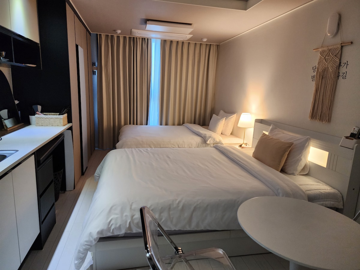 * 1 min promenad från tunnelbanan st. * Bussen stannar precis framför byggnaden. * 1 stopp från KTX Dongdaegu St. 2~3 hållplatser från det varmaste centrumområdet och 15 minuter från flygplatsen. * 24 timmars CVS-butik (GS25) på 1: a våningen och marknader i närheten * Fullt möblerad studio med tvättmaskin, kokvrå och toalettartiklar (coola välkomnande flaskor med vatten och te tillhandahålls) * Gratis wifi och mycket parkeringsplats * Beläget i säkert område lättillgängligt och sett från huvudboulevarden * Närmaste tunnelbana till KNU & shuttle