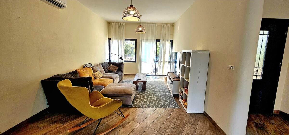 En rymlig plats lämplig för familjer, med gott om utrymme att tillbringa tid tillsammans. Huset har 2 sovrum med en dubbelsäng (sovrum 190/160 * låg sängmadrass * * gästrum 190/140) och ett annat barnsovrum med en enkelsäng och 2 enkelsängar. Det finns möjlighet att lägga till en enda madrass i det stora sovrummet och en campingspjälsäng. Huset har ett stort centralt utrymme med ett bekvämt och fullt utrustat kök och massor av sittplatser runt och utanför huset. Det finns ett stort däck med utsikt över bergen med grillplats, stort gräs och studsmatta. Huset ligger på gångavstånd från bäcken inuti kibbutzen och under säsongen finns det möjlighet att komma in i kibbutzpoolen mot en avgift vid ingången.