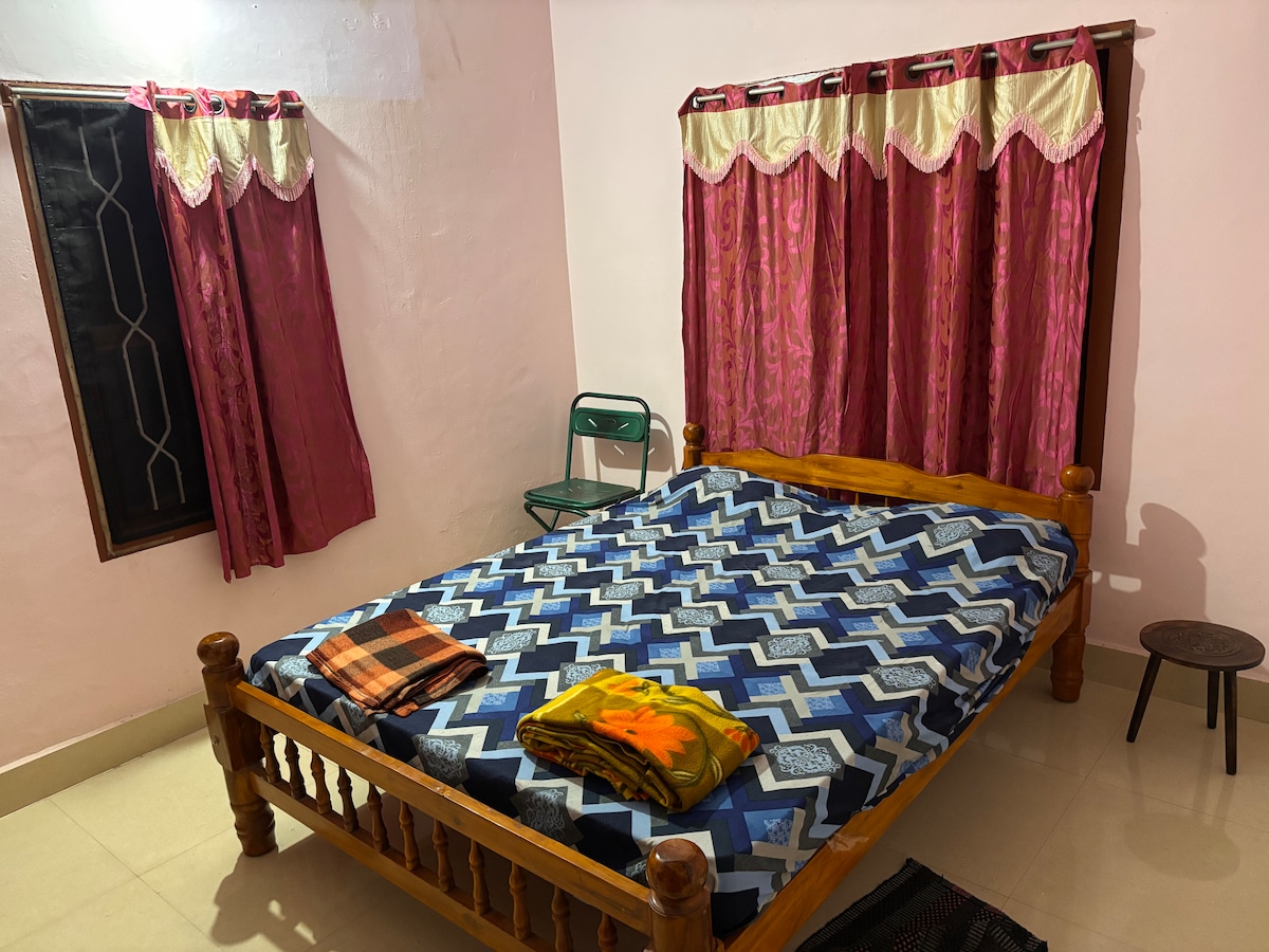 2 km från busshållplatsen i Madikeri. FESTANDE/ALKOHOL/BRASA EJ TILLÅTET (bostadsområde). Hus på bottenvåningen med 2 SOVRUM, angränsande badrum, elektrisk varmvattenberedare, toalett. Två dubbelsängar (4 × 6) i sovrum nr 1. En queensize-säng (160 x 180 cm) i sovrum nr 2. Extra dubbelsäng (4x6) och soffor i VARDAGSRUMMET. Fullt utrustat KÖK. MATPLATS. Tvättmaskin. Rena lakan och kuddar. Piedestalfläktar. Strömförsörjning (endast UPS). Wifi 100 Mbit/s. Smart-TV med OTT. Endast bilparkering (TT-parkering 300 meter bort). Förartvättrum.