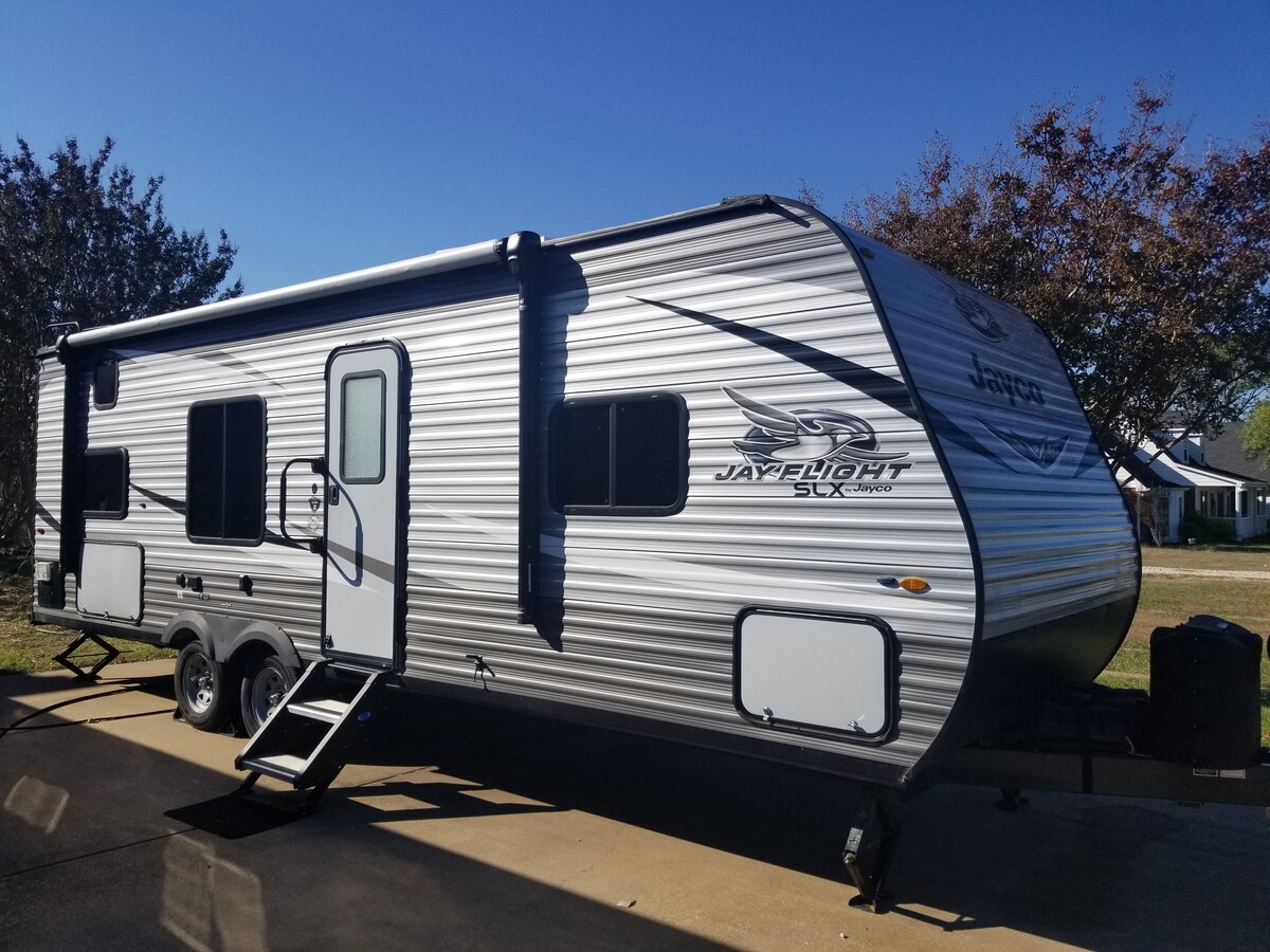 Stella Buttercup, en 1959 Shasta Airflyte med vingar, är en vackert ombyggd husvagn redo att flyga! Hon rymmer 3-4 personer. Vi kan ställa upp på statliga parker, campingplatser, privat egendom eller en uppfart som gästhus. Minst 2 nätter krävs. Vi erbjuder leverans till en plats efter eget val inom 45 miles från Dallas, ytterligare leverans kommer att vara $ 1,00/mile. Vi har ingen permanent plats. Du kommer att ansvara för bokningen av campingplatsen. Observera att leverans ingår i städkostnaderna.