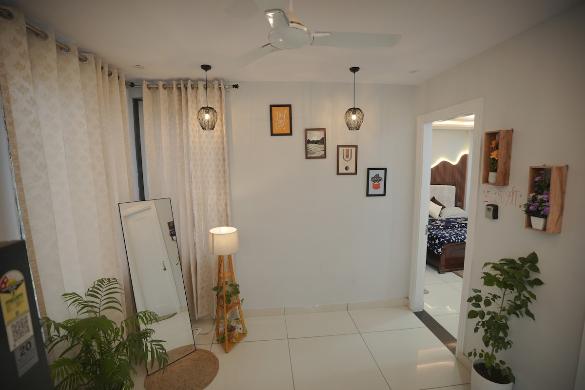 Välkommen till Midnight Moon Retreat, en lugn och elegant mörk lyx 1BHK inspirerad av skönheten i månen och natthimlen. Sovrummet har en glödande månskensvägg, mjuk omgivande belysning och djupa koltoner som skapar en mysig, avkopplande och förstklassig atmosfär. Detta boende är perfekt för par, ensamma resenärer eller någon som letar efter en privat och estetisk vistelse.