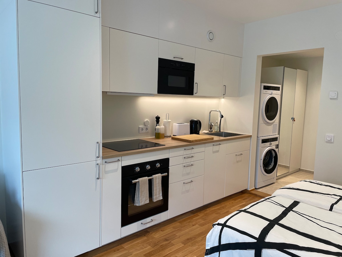 Very close to the city, all amenities, services and the metro and buses are a 5 minute walk away. Quiet, peaceful and beautiful surroundings with nice walks by the water. Newly built, modern, well equipped 30 sqm apartment with excellent sound proofing. The large room has two single beds 90cm wide, (can be put next to each other) , tv , sitting area with sofa, dining area, a full kitchen, a well planned bathroom with shower and a laundry area with washing machine, drier and a cupboard.
