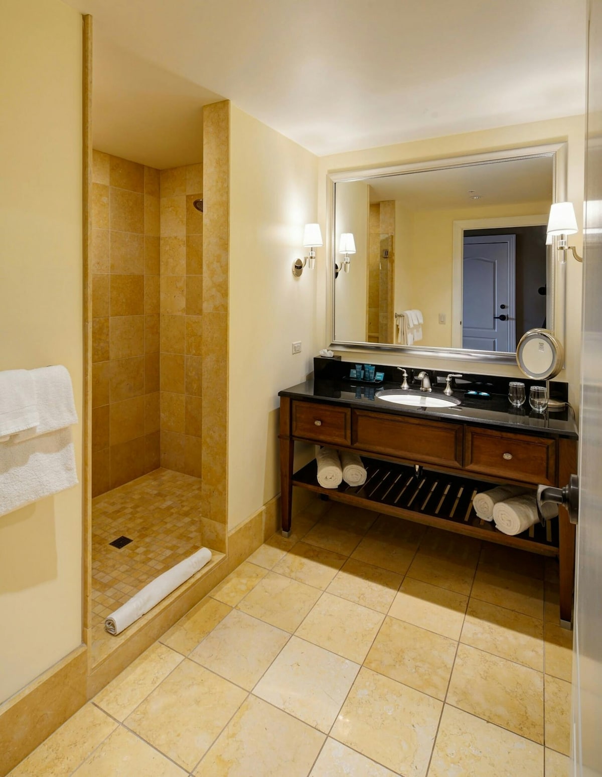 Rymligt sovrum med dubbelsäng och välutrustat badrum