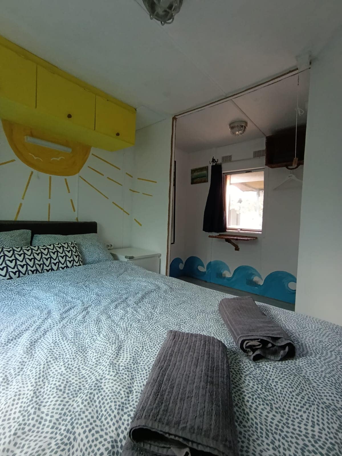 Litet utrymme men med allt du behöver: tre sängar ligger på två små gallerier som kan nås med stegar. På nedervåningen finns en bäddsoffa och vardagsrum/matplats. Genom ett stort fönster har du en underbar utsikt över vår fruktträdgård. Vi är privata värdar och är inte värdar kommersiellt. Eftersom det är en del av vårt vardagsliv kan det hända att inte allt går smidigt. Kontakta oss gärna så hittar vi en lösning :-).