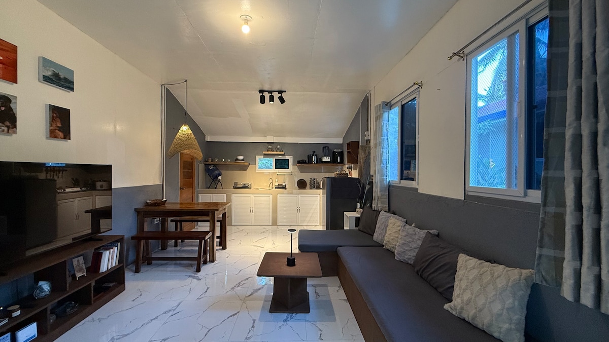 Denna tropiska stuga med service blandar elegant modernt boende med provinsiell lugn, med två rymliga sovrum som är perfekta för par eller en liten familj. Oavsett om det är för fritid eller distansarbete garanterar denna dolda pärla i Malinao atmosfären av ett riktigt hem – som erbjuder mysig vila med lugnande naturligt ljus och ljud, omgiven av en frodig tropisk trädgård. Och på bara fem minuters bilresa kommer du att fördjupa dig i General Lunas livliga energi.